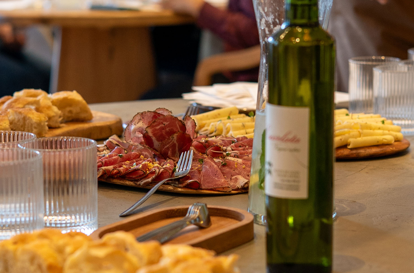 La anfitriona fue María Urrutigoity, que lleva más de veinte años de cocina a sus espaldas y aún conserva la costumbre de recibir a todos como en casa. Junto a sus socias, Mariana Martínez y Paz Bombal, armó un espacio donde la bienvenida ya anticipaba el tono de la noche: charcutería artesanal, quesos que pedían un sorbo de vino y esa focaccia mullida perfecta para mojar en el aceite de oliva Escarlata de Gabriela Celeste. Pequeños gestos que te hacen bajar la guardia y pensar “ok, acá me voy a quedar un buen rato”.